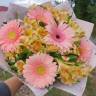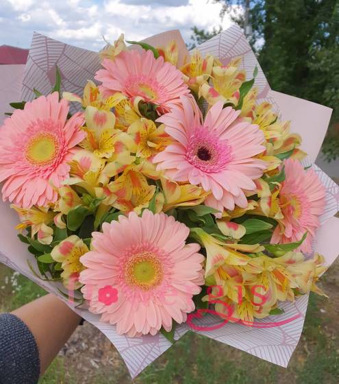 Пять роскошных розовых гербер в сочетании с солнечными фрезиями выглядят великолепно и дают возможность поздравить с торжеством любимую, подругу, коллегу или родственницу. Можно бесконечно долго любоваться прекрасными цветами с шикарной флористической композицией. Дизайнерская оберточная бумага с абстрактным рисунком подчеркнет идеальную аранжировку и красоту цветов.